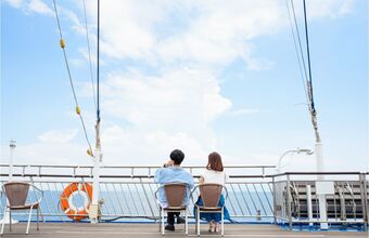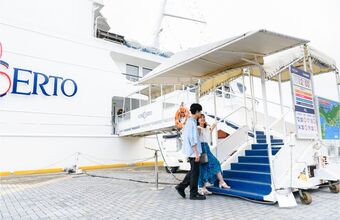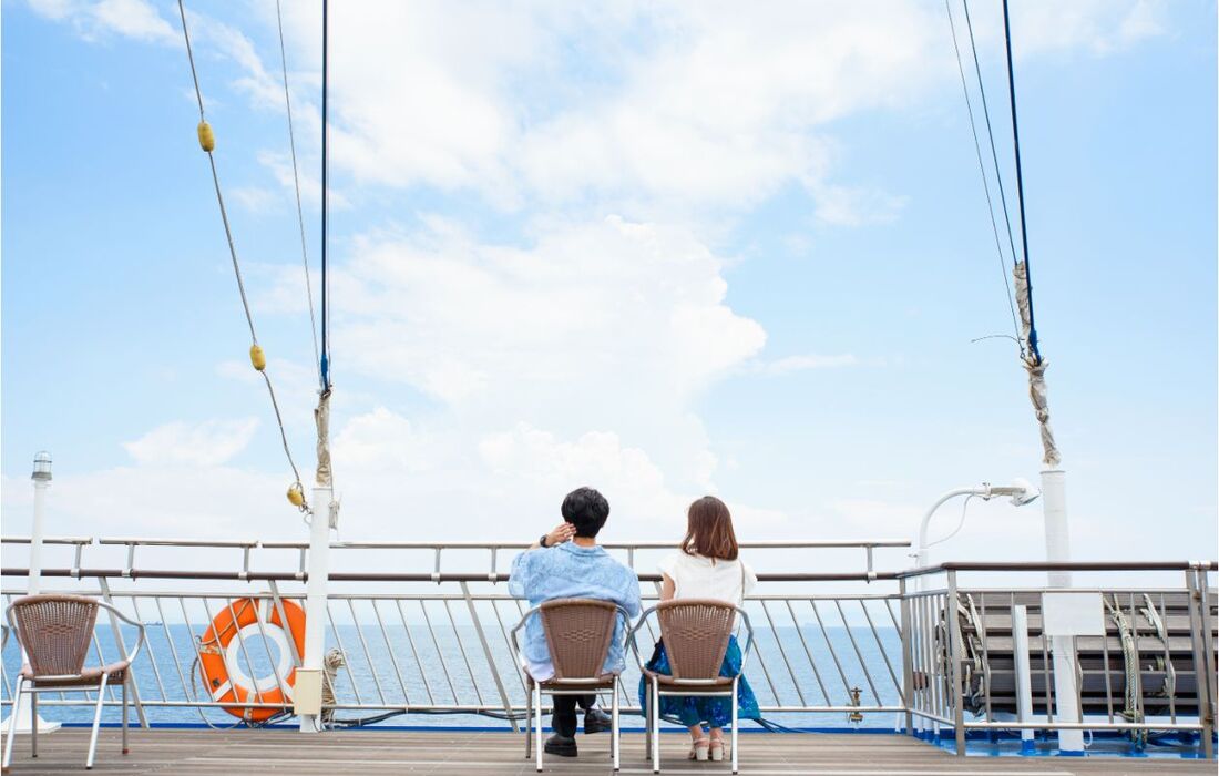 光が差し込む明るい船内、メインマストがそびえる開放的なデッキ、船内からも船上からも青空を満喫できる空間で、ぜいたくなひとときをお過ごしください。