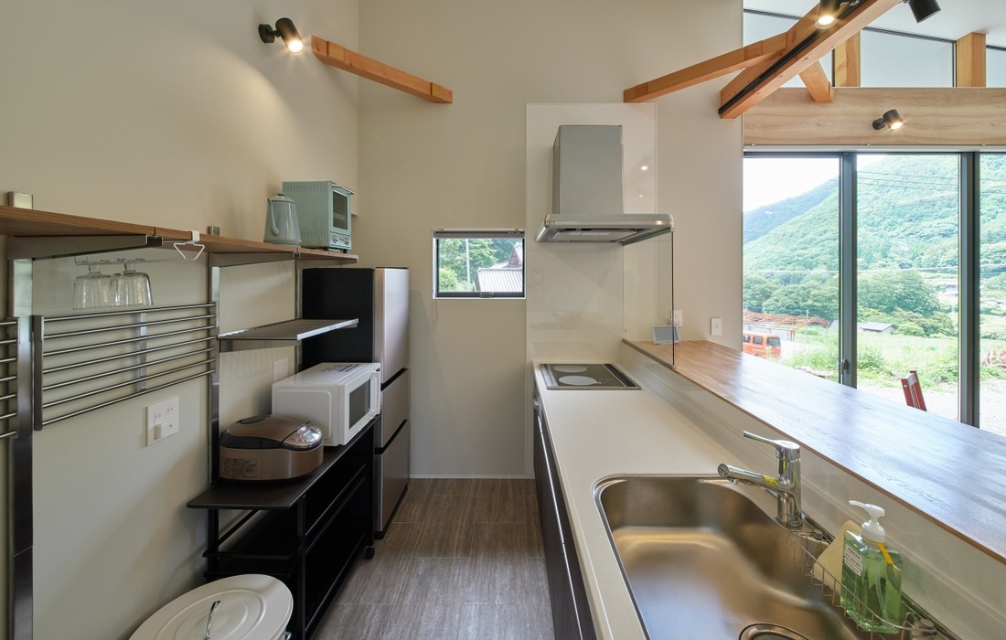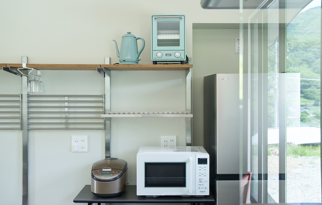 ・冷蔵庫・IHコンロ・電子レンジ・トースター・炊飯器・ケトル・基本的な調理器具・基本的な鍋・フライパン・食器・カトラリー(箸、フォークなど)・カップ・グラス・ワインオープナー・栓抜き・缶切り・ラップ・アルミホイル
