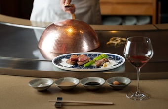 活気あふれる福岡県・博多の街の鼓動をそっと包み込むようにたたずむ「ホテルオークラ福岡」。当体験コースで楽しめるのは、同ホテル2階「鉄板焼 さざんか」での鉄板焼ディナーコース料理です。