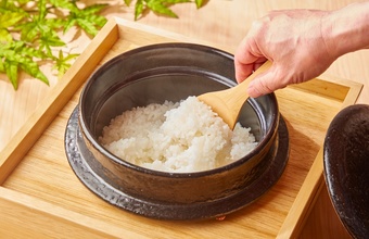 看板料理の一つ目は、脂の乗った日本海の高級魚「のどぐろの一夜干し」。焼くと皮がパリッと香ばしく、身はふっくら。うま味が凝縮されています。そして二つ目は、「雪室(ゆきむろ)熟成和牛のステーキ」。雪室とは、新潟県の山間部で昔から利用されている雪を利用した、天然の冷蔵庫のこと。そんな雪室の中でじっくりと和牛を熟成させ、肉本来の味わいを最大限に引き出します。炊きたての土鍋ごはんは、新潟県特別栽培認証米の胎内産クラシックコシヒカリです。