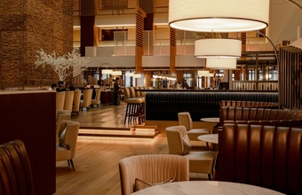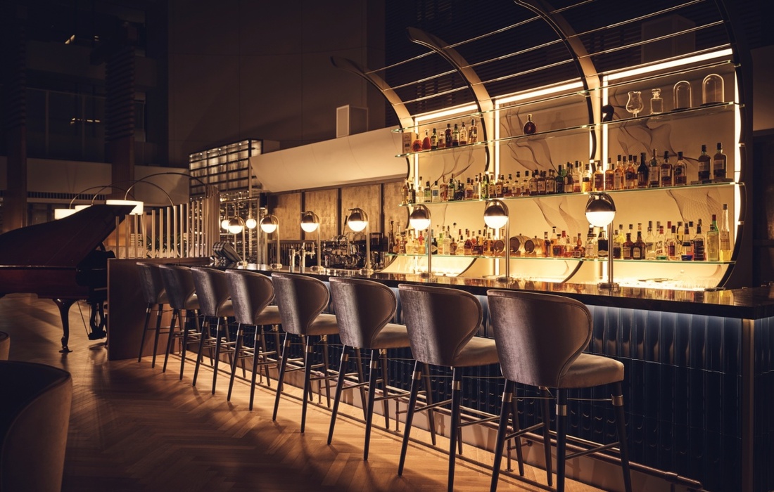 天井高27mの吹き抜けが広がる、開放感たっぷりのカフェ&バー「リュトモス」。ホテルロビーに隣接した上質で落ち着いた空間が、日常から少し離れた心地よい時間を演出します。