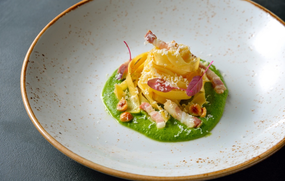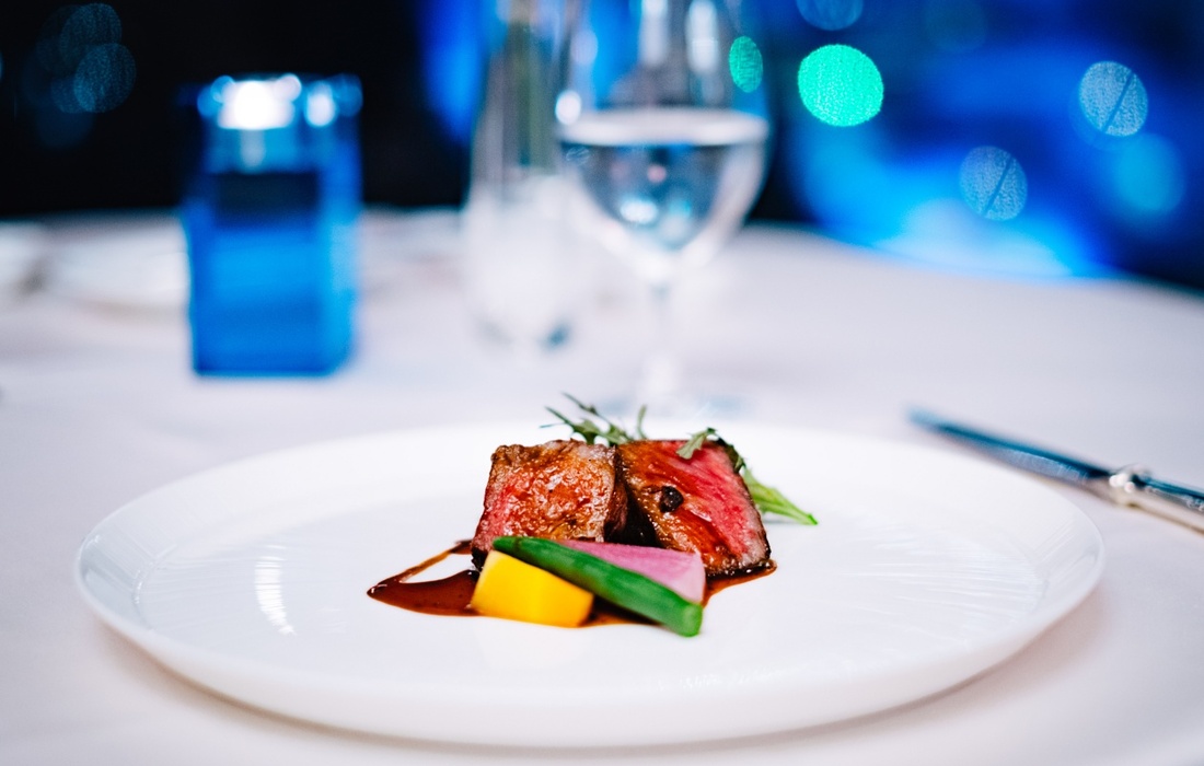 グラスシャンパンで乾杯をしたら、キャビアを使ったアミューズから。季節の食材を生かした鮮やかな料理や自家製の手打ちパスタ、リゾット、魚と肉のメイン料理......と、イタリアンのフルコースを楽しめます。