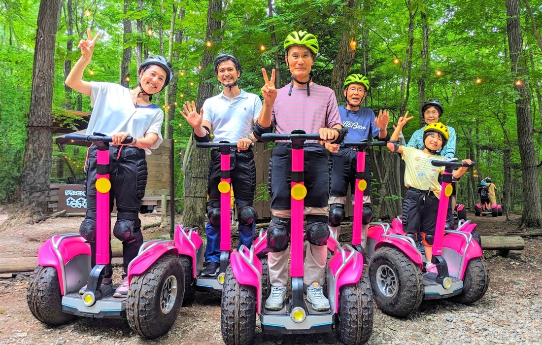 コンセプトは「森と遊ぼう!」で、フィールドは約10,000平米の広葉樹の原生林。ジャイロライド用に作られた周回コースを駆け巡れます。コースは、途中で枝分かれしており、初心者向きの「簡単コース」から、細い林道や丸太を避けながら進む「チャレンジコース」などから選択。コースなど複数コースを選択可能です。はじめにレクチャーや練習コースの体験があり、明るくホスピタリティーのあるスタッフがサポートしてくれるので笑顔でチャレンジできます。おおむね5歳からおよそ80歳まで、幅広く楽しめます。