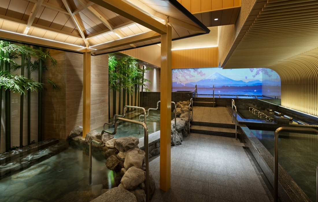 大浴場エリアには天然温泉の源泉風呂や高濃度炭酸泉・マイクロバブルバス・人間工学寝湯など多彩な湯船が。また、男性・女性それぞれのニーズに合わせた複数のサウナも用意されており、シャワーヘッドには超微細な気泡で知られるサイエンス社の「ミラブル」を採用。