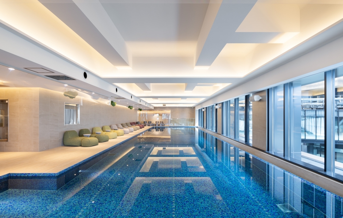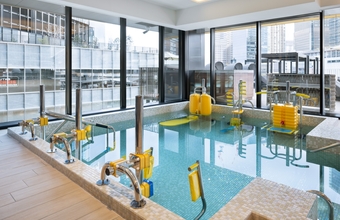 屋内プールエリアでは、アクアエクササイズやアクアジムで関節の負荷を軽減する水中運動が可能。プールサイドには、トレーニング後やリラックスタイムにドリンクを楽しめるバーもあります。