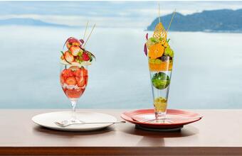 カフェタイムは、ホテルの系列施設で「オーシャン・ウイング」館から徒歩約5分の「Restaurant & Sweets 花の妖精」にて。クラシカルな雰囲気の店内と一面に広がる海を眺めながら、季節ごとに趣向を凝らしたパフェをご堪能ください。