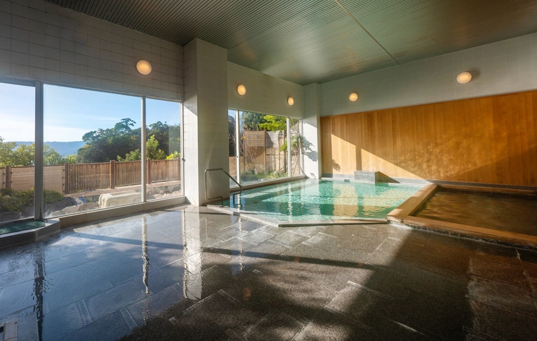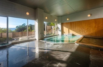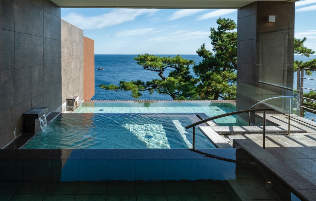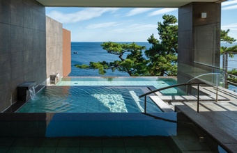 温泉は、広い館内に3箇所ある大浴場のすべてを利用可能。趣きの異なる浴場は、それぞれ別の自家源泉を引いており、泉質の違いを楽しみながらの湯めぐりができます。中でも特におすすめなのが、敷地内で最もロケーションの良い場所に建てられた絶景温泉「スパリウムニシキ」。海と一体化したようなインフィニティデザインの露天風呂です。見渡せば海、見上げれば空が目の前に広がる天空の露天風呂では、船の往来、雲の流れが時の流れを忘れさせてくれることでしょう。ゆったりとしたひとときをどうぞ。