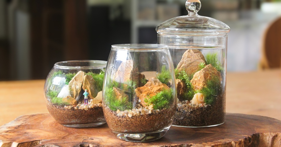 苔に興味がある人や、ミニチュアの世界観が好きな人などにおすすめの体験。手乗りサイズの容器に、複数の苔と石や砂を組み合わせて容器の中に自分だけのテラリウムを作ります。別売りのフィギュアを入れると小さな世界がさらに広がります。