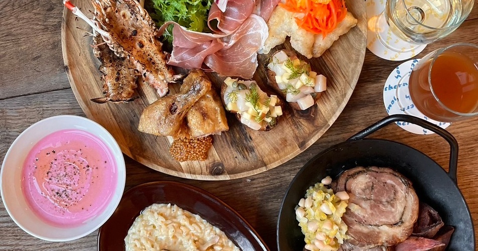 料理は看板メニューでもある前菜盛り合わせからはじまり、パスタまたはピザ、メインの肉料理と満足感たっぷりのコース形式で提供。旬の湘南野菜や三浦野菜をふんだんに使い、彩り豊かでおいしい料理を堪能できます。デザートには神奈川の人気洋菓子店のジェラートを。