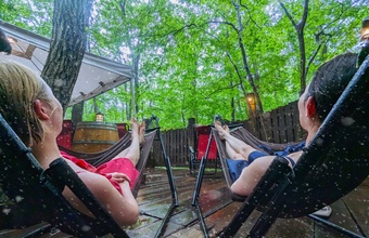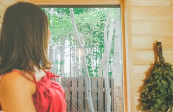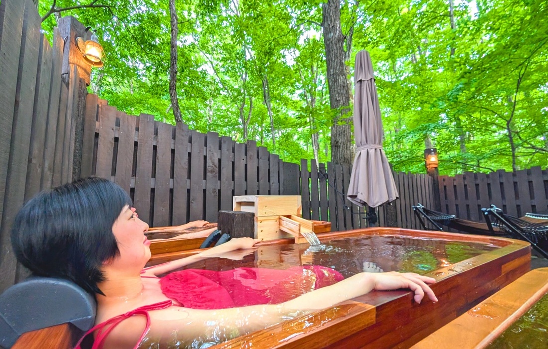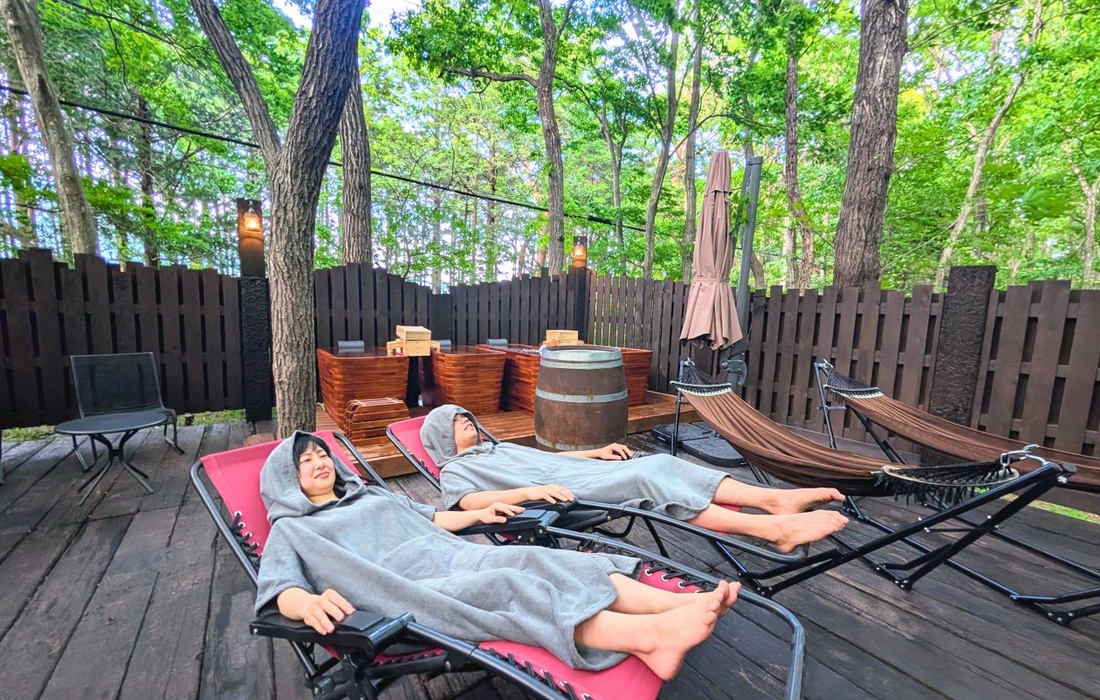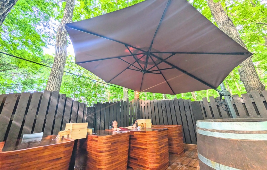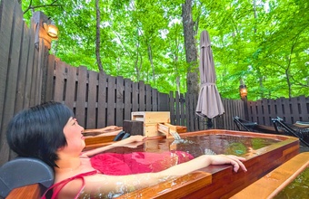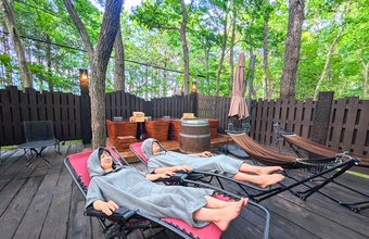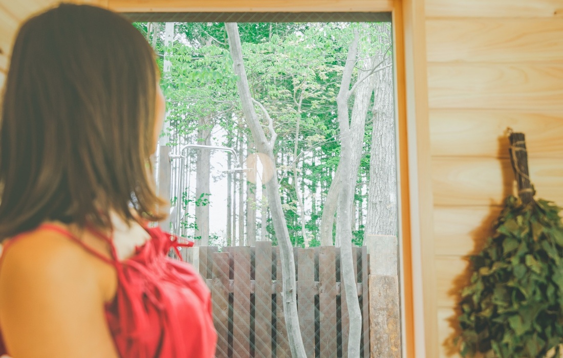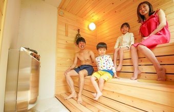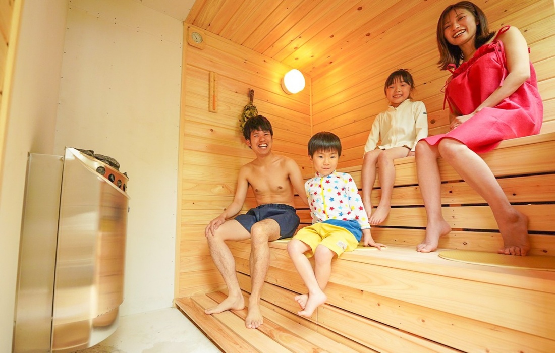 フィンランド製の本格的なサウナストーブを導入(MISA製)。蒸気を楽しむオリジナルの「ほうじ茶ロウリュ」もセルフでできるので、思う存分サウナを満喫できます。水風呂・露天風呂もあり、ツリーハウス型で高い位置にあるので、人目を気にせず、小さな子どもと一緒でもゆったりと過ごせます。