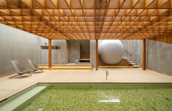 「心と体を整える、大人のためのリゾート」をテーマとするこちらのリゾート施設。シンボル的存在であるクラブハウスの建物は、ナチュラルウッドを基調にした自然なあたたかみと、グレーのモルタル調でデザインされた居心地のよい雰囲気です。1階に設けられたリゾートスパもその素材感を引き継ぎ、大人の上質な時間が流れています。