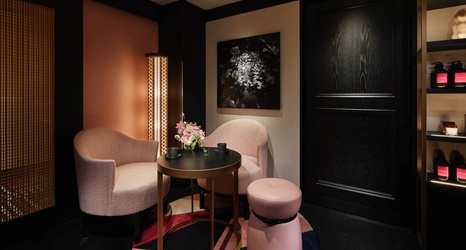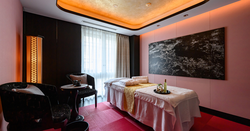 ホテルに入ると、ブランドカラーであるフォションピンク、ホワイト、ブラック、ゴールドをあしらった唯一無二の空間が広がります。ピンクに染めた畳などこだわりが随所に光るスパルームで、京都とパリを結ぶ至福の旅へと誘います。