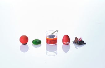 蕾や花芯に見立てた卵型のスイーツは、カモミールが香るストロベリームースにミントのクリームを合わせました。