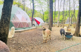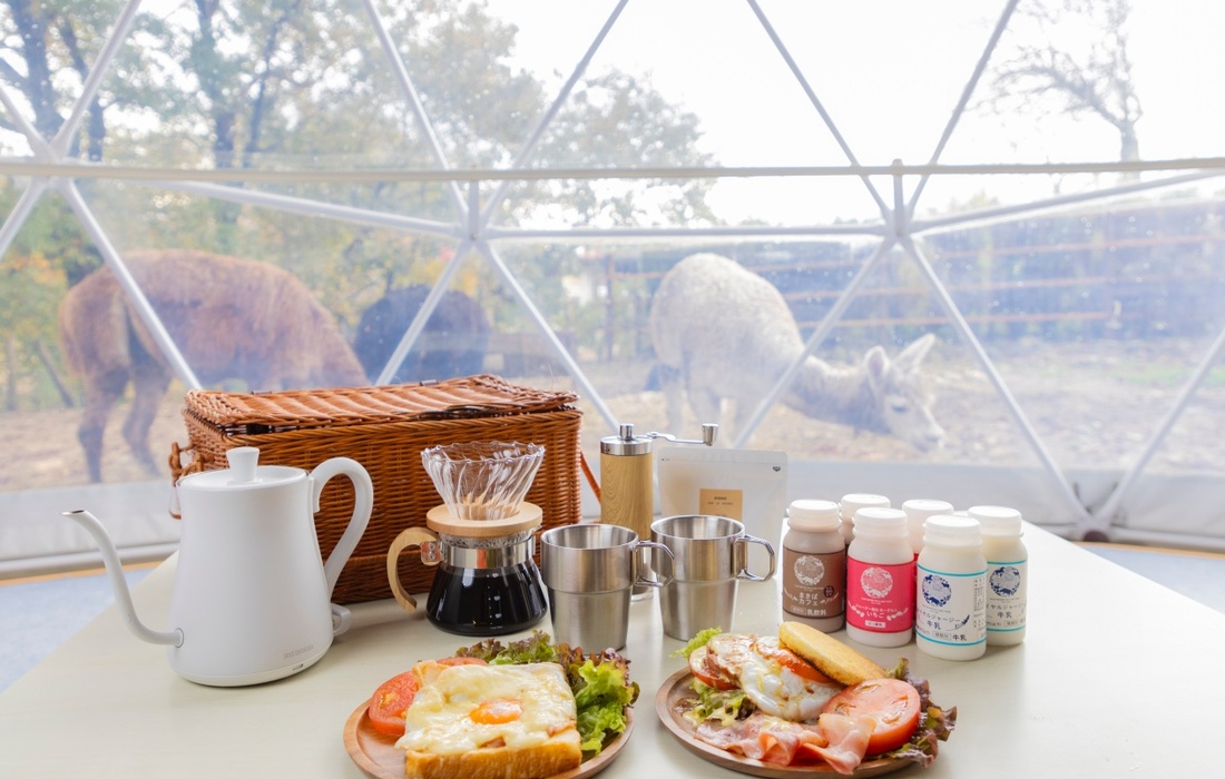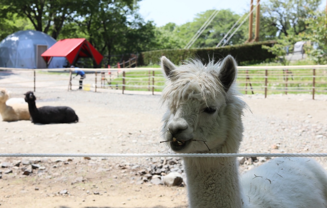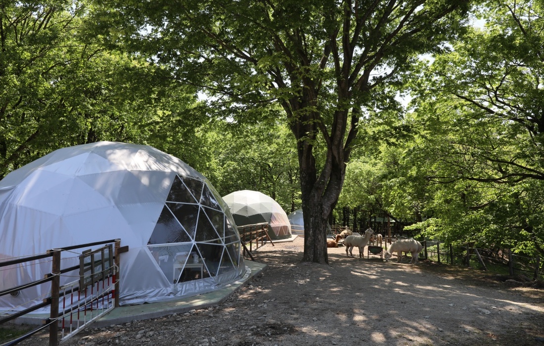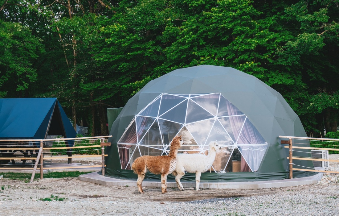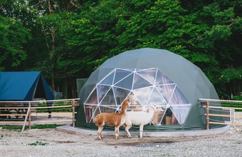 栃木県那須町の複合型テーマパーク「那須高原りんどう湖ファミリー牧場」。園内のアルパカの群れの中に設置された、グランピング施設での宿泊コースです。(1泊2食付き)