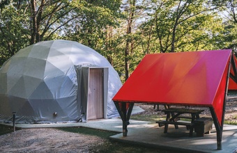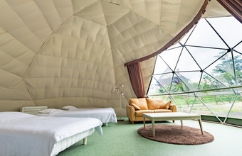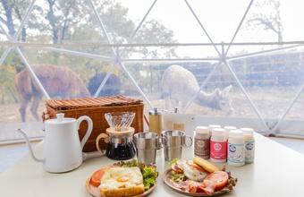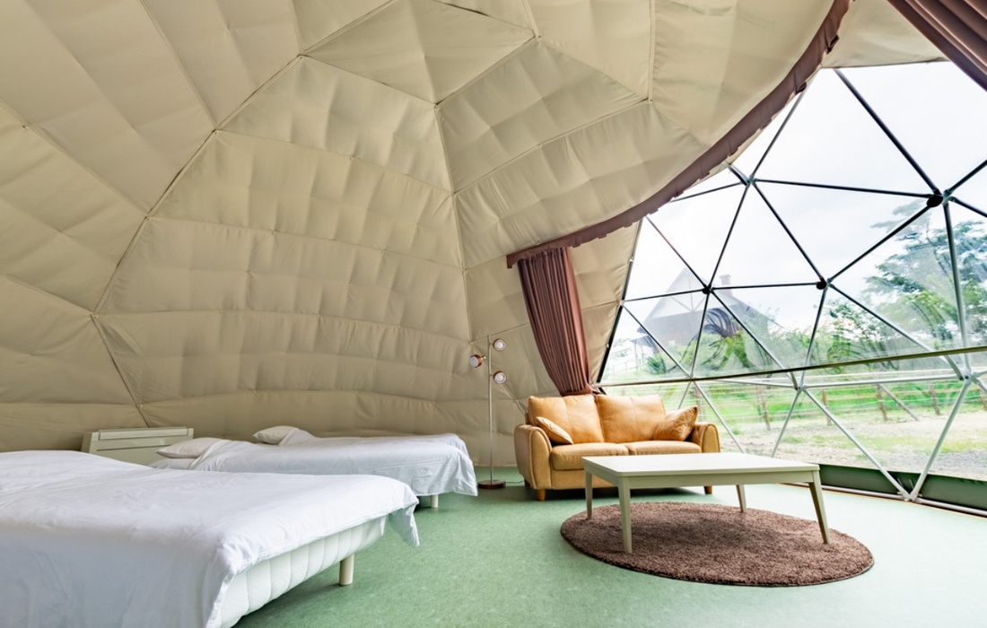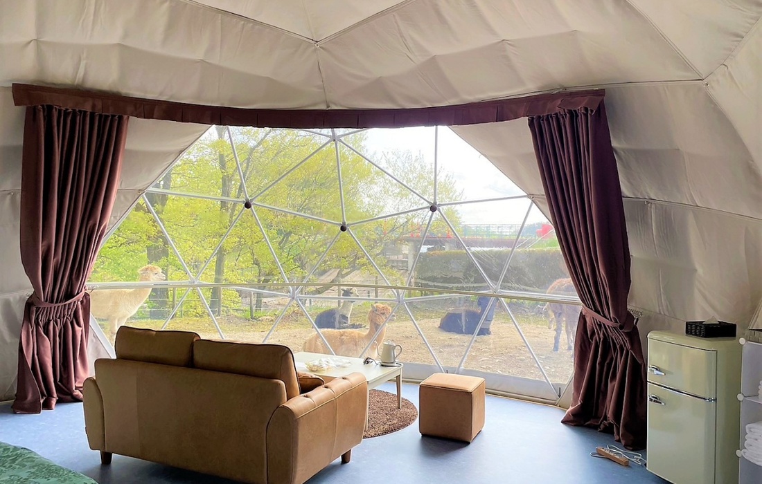 「日本初、アルパカと泊まれるグランピング」として知られる同施設。アルパカの群れの中に柵で囲まれたテントが設置されており、アルパカ好きにはたまらない非日常を堪能してください。アルパカにえさをあげたり、ドームテントからアルパカの様子を観察したりと、ユニークな体験が待っていることでしょう。