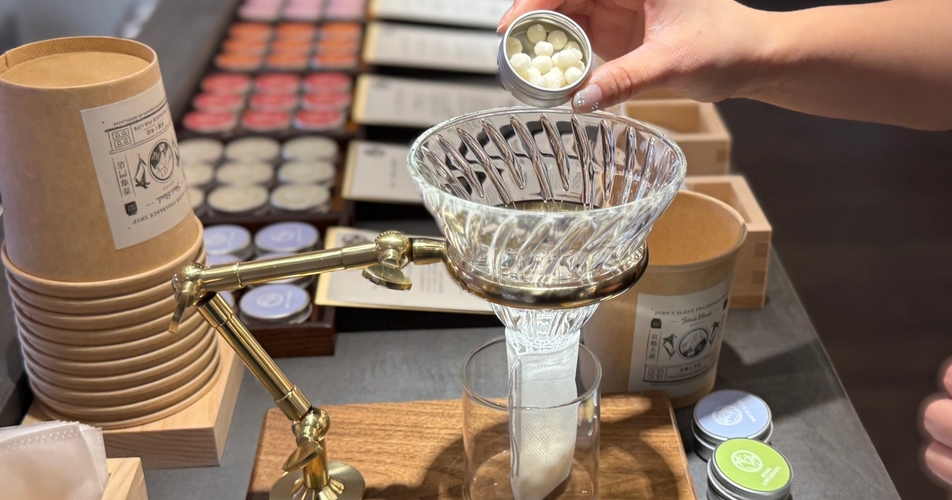 すべてのパーツを選び終わったら、いよいよ仕上げに移ります。コーヒードリッパー状の専用器具の下に選んだ袋をセットし、選んだ芳香ボールをコロコロと入れて袋に詰め、組みひもを通せば、オリジナルのサシェが完成です。