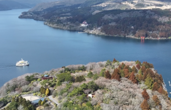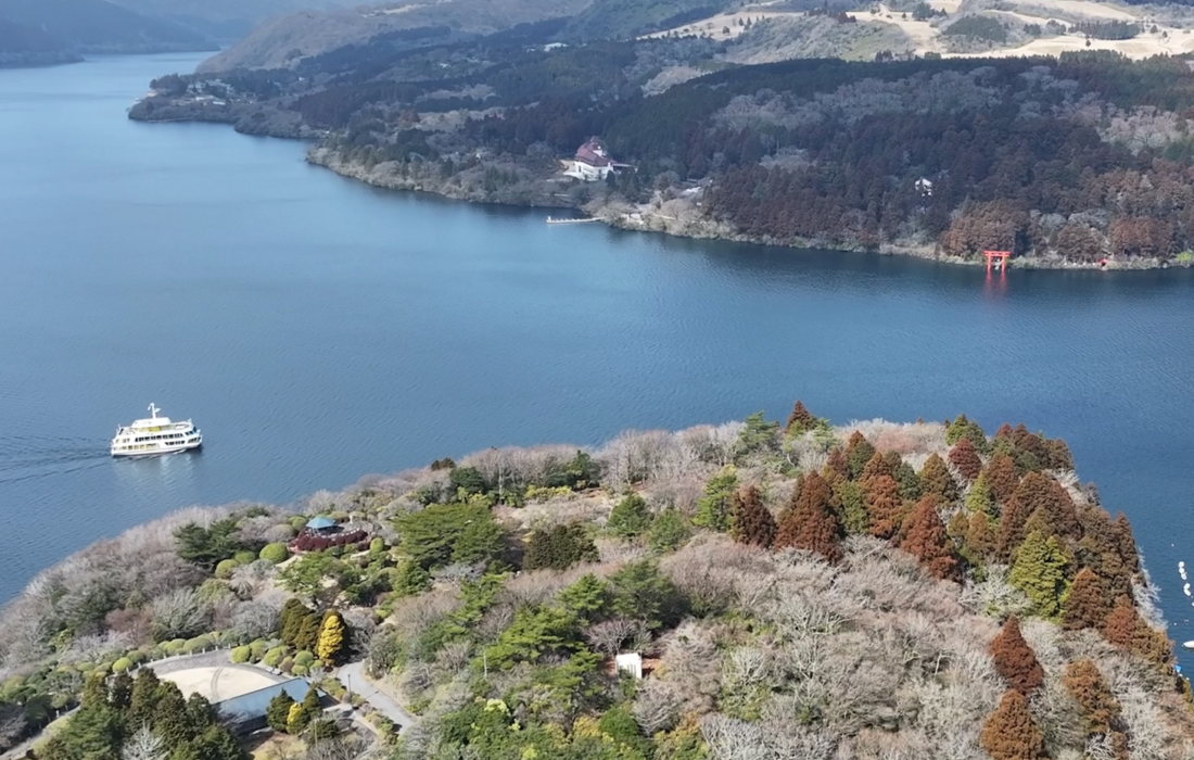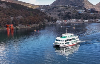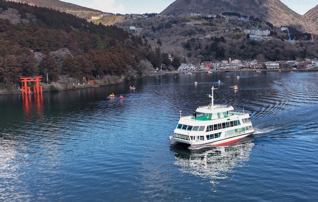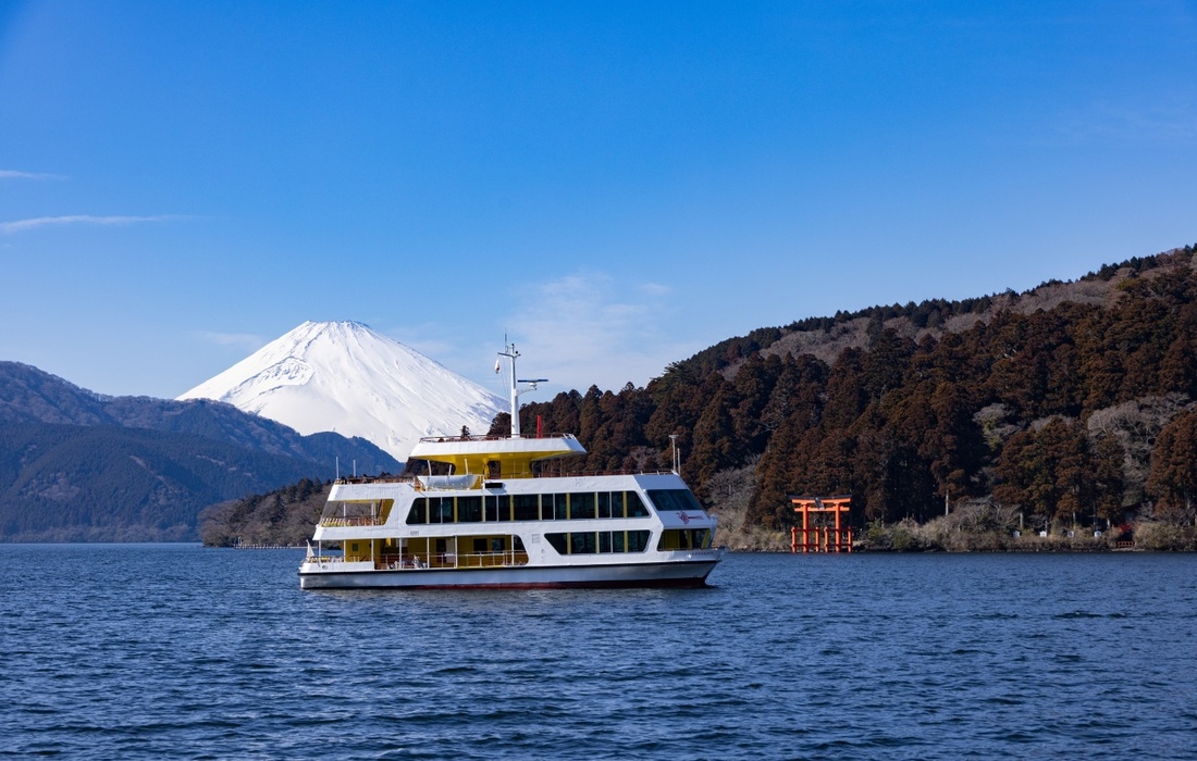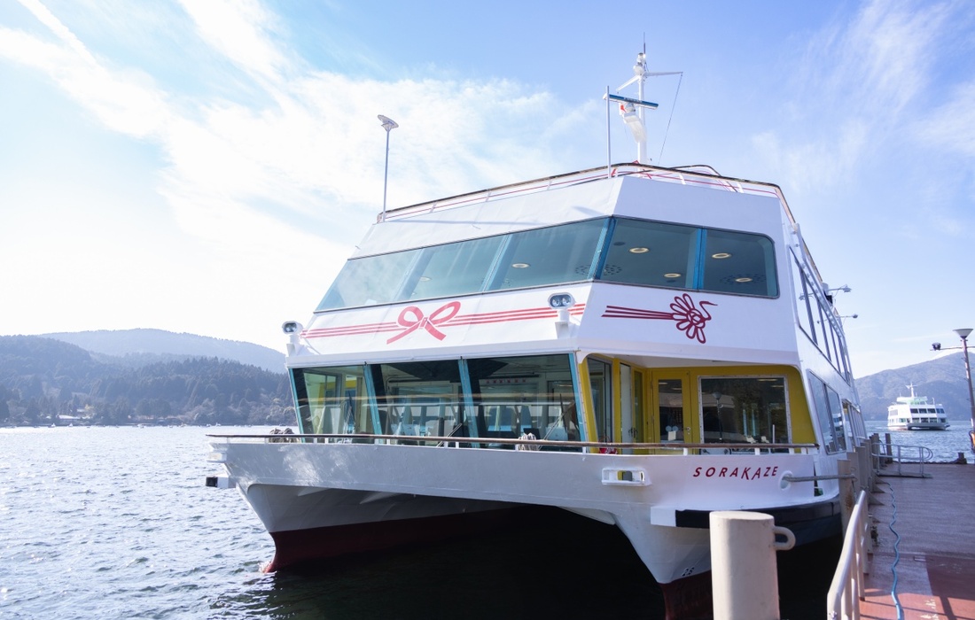 神奈川県・箱根山上の景勝地、芦ノ湖(あしのこ)。こちらのコースでは、箱根遊船「 SORAKAZE(ソラカゼ)」に乗船して、関所跡港・元箱根港・箱根園港の3つの港を経由しながら、芦ノ湖を約40分間で周遊します。