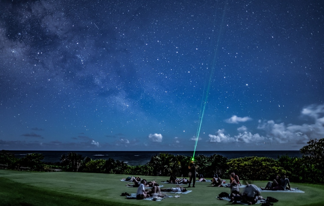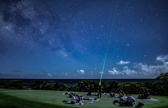 当コースでは、宮古島に魅了され、県外から移住してきた夫婦が主宰する「星空ナビすばる」の星空ツアーに参加できます。ゴルフ場を借り切り周囲に光がない状態で、天体望遠鏡や双眼鏡を使って月のクレーターや太陽系の惑星を観測。ガイドがレーザーポインターで星の位置を示しながら説明するため、誰でも星座を見つけることができます。