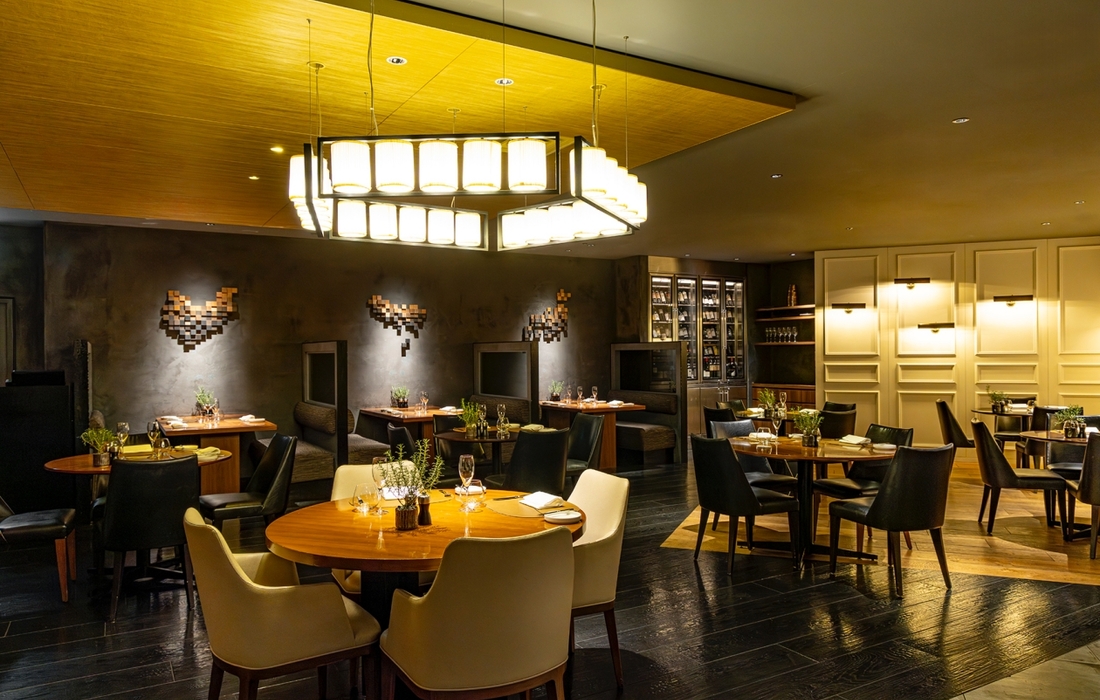店内はレンガの壁が印象的なあたたかみのある空間で、中央に設けられたガラス張りのグリルカウンターでは、シェフが豪快に焼き上げるライブ感を楽しめます。