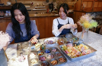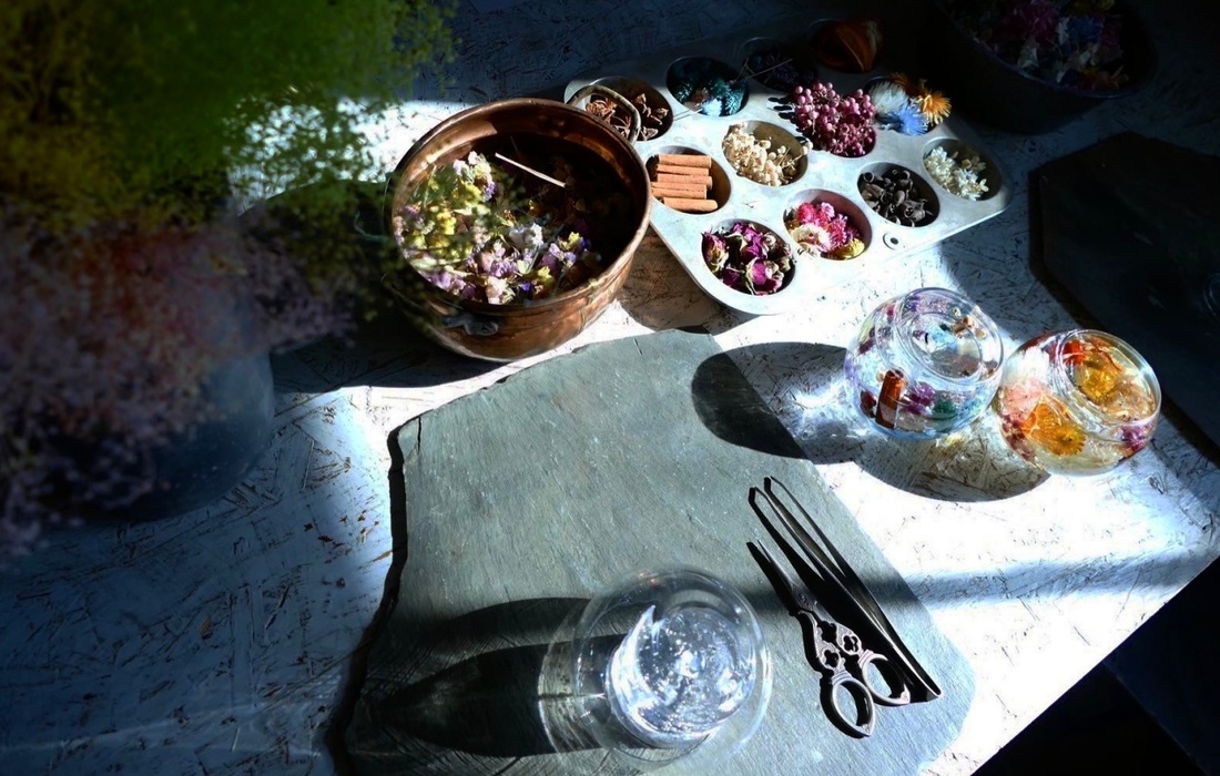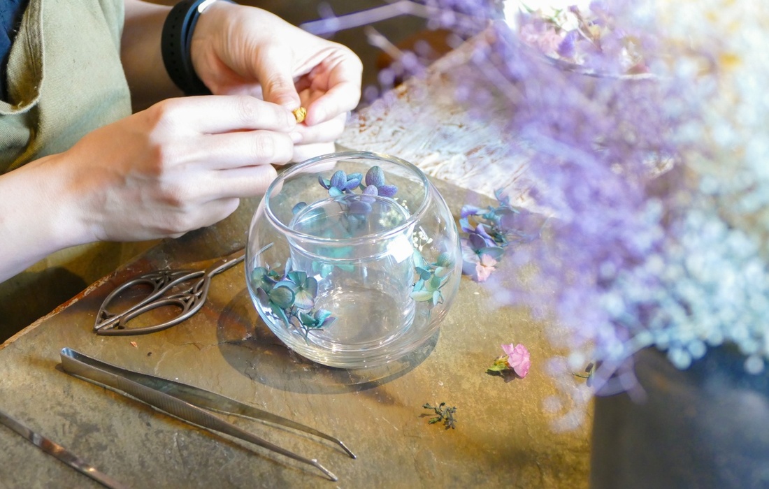 当コースでは、この空間でボタニカルジェルキャンドル作りを体験できます。透明なグラスの中に、季節のドライフラワーを自由にレイアウトし、ジェルキャンドルを流し込んで美しさを閉じ込めます。完成した作品はそのまま当日持ち帰れます。