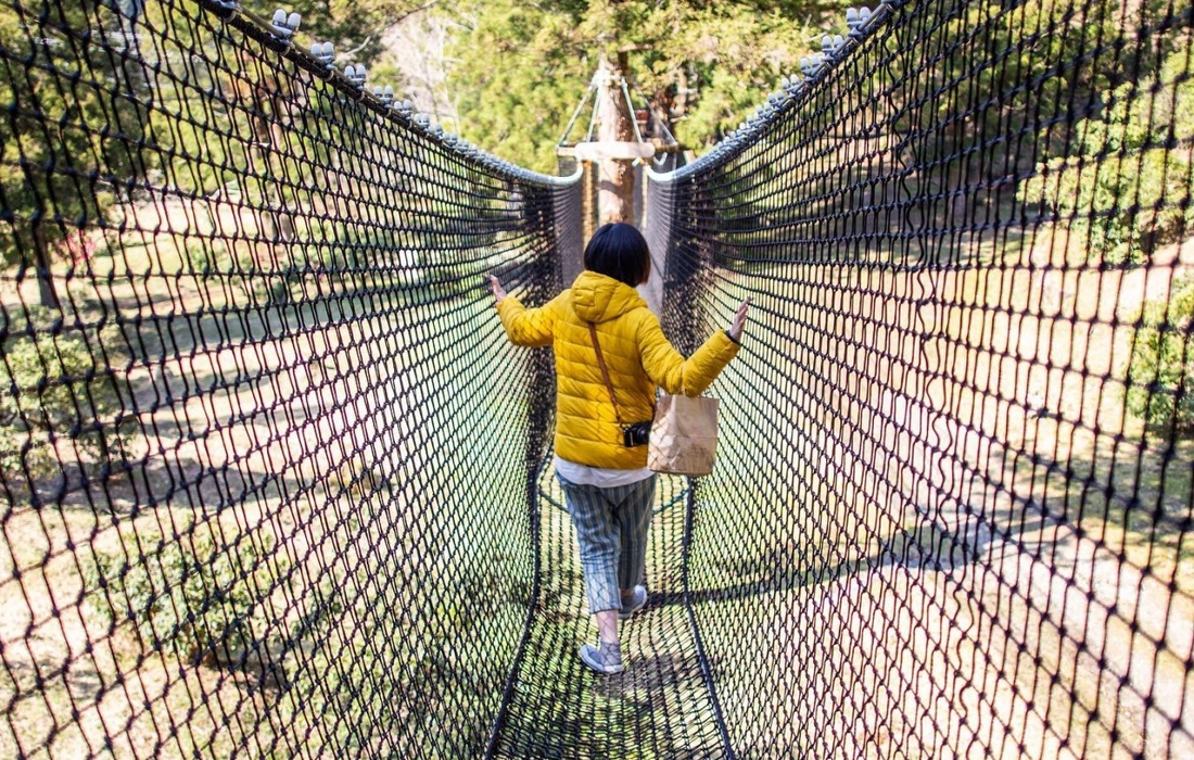 「空中の村」は、2020年4月にフランスから移住したジョラン・フェレリ氏がオープンしました。ツリーハウスの固定工法や吊り橋の編み込み技法にはフランスの技術を用いる一方で、村の資源の活用にもこだわり、ベンチや遊具には地元産の木材を使い、遊歩道には間伐材のチップを敷き詰めています。