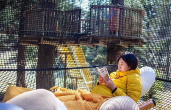 「空中ウォーク」では、地上4〜12メートルの高さの木々の間に架けられた網の吊り橋を歩きます。11棟のツリーハウスをつなぐ吊り橋は、5つのエリア、2ヘクタールの異空間への冒険へと誘います。自然の地形をそのまま活かしたアクティビティで、空中での森林浴を満喫しましょう。