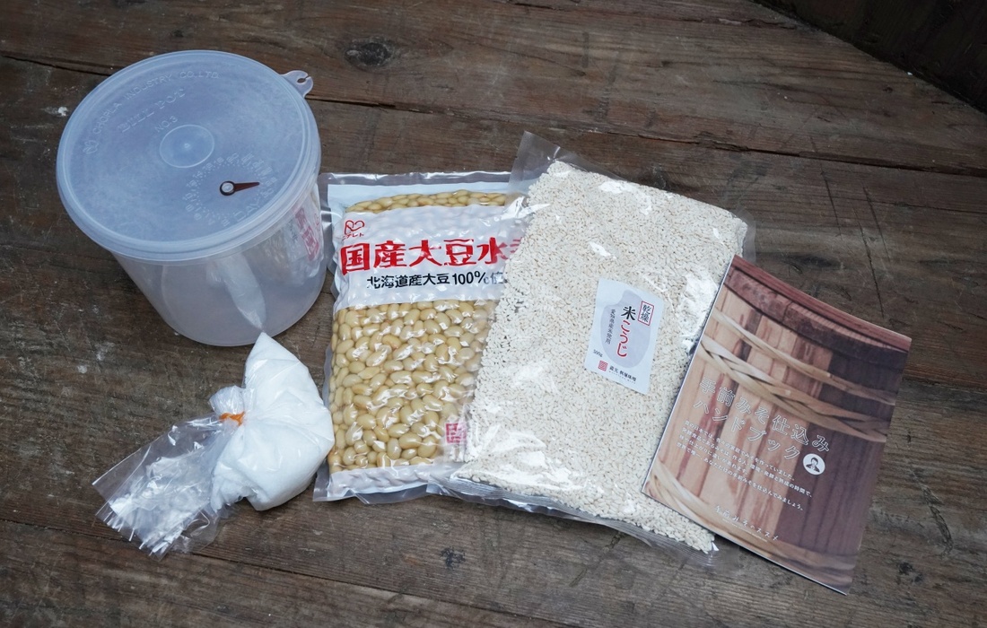 ・みそ作りキット2kg (水煮大豆 1kg・米こうじ 500g・塩 200g・作業用袋 大/小各1枚・手前みそ仕込みハンドブック・蔵元問い合わせサービス)
