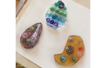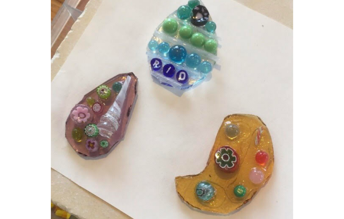 10色の板ガラスから好きなものを選び、カットしてベースになる形を作ります。そのベースの上に、まるで金太郎飴のように模様が入ったミルフィオリと呼ばれるガラスビーズを、お好みのデザインになるように配置していきます。デザインが完成したら、職人が電気炉に入れて焼成し、金具を取り付けた後に郵送にてご自宅へお届けします。