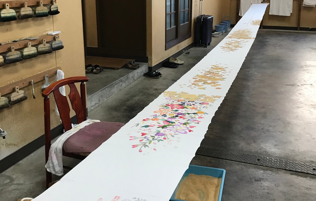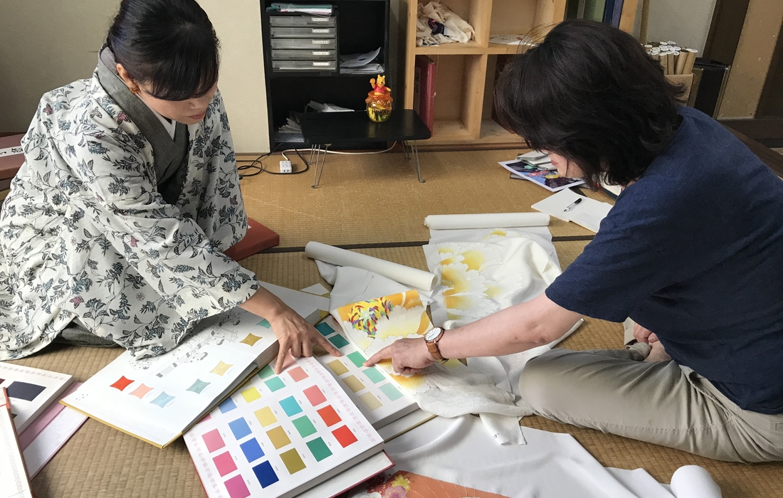 きものカラーコーディネーターの意見と友禅作家の協力のもと、生地から丁寧に作られた同店の加賀友禅。金沢の街並みに合うだけでなく、人に映える色と柄を分析し、デザインされた着物がそろっています。下絵から手描きで仕上げ、線の一本、色のぼかし一つにも職人の熟練技が生きる一点物の数々は、「和」が残る金沢の街で上品な美しさを放つでしょう。