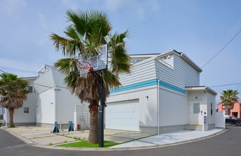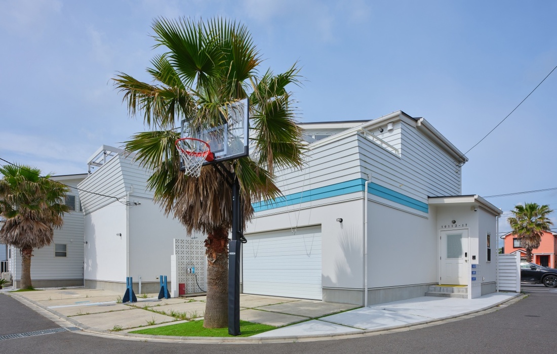 千葉県・九十九里浜(くじゅうくりはま)にたたずむ貸別荘「Surf & Turf 一宮 South(サーフアンドターフ イチノミヤ サウス)」。人気のサーフスポットとして知られる一宮海岸まで徒歩圏内のロケーションです。シンボルツリーの大きなヤシの木と白を基調とした外観が印象的。海外のビーチリゾートを思わせる雰囲気の中で、ゆったりとした滞在を楽しめます。