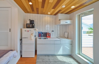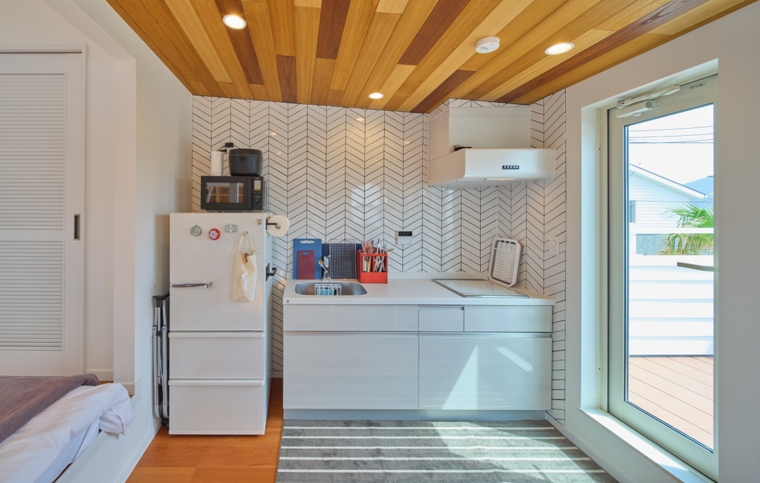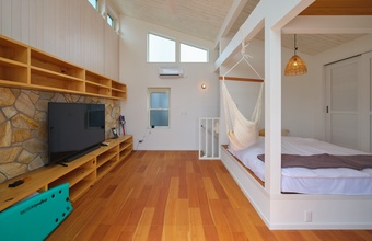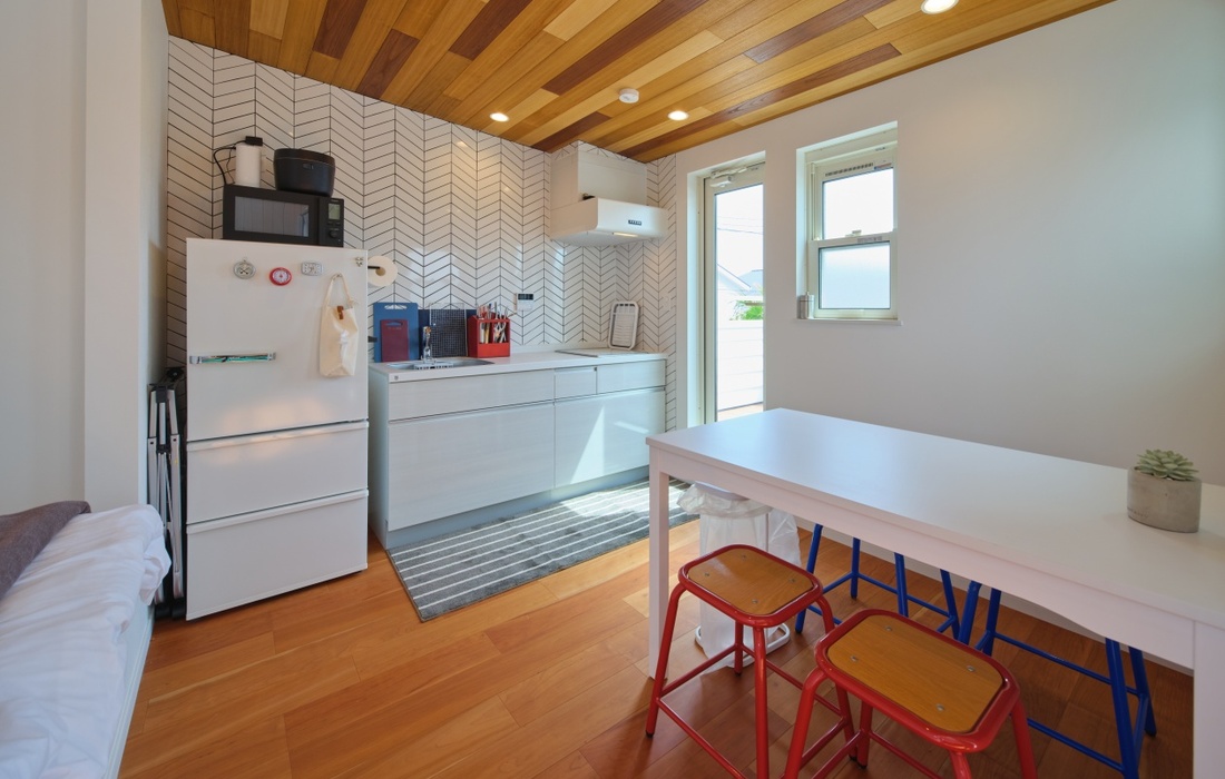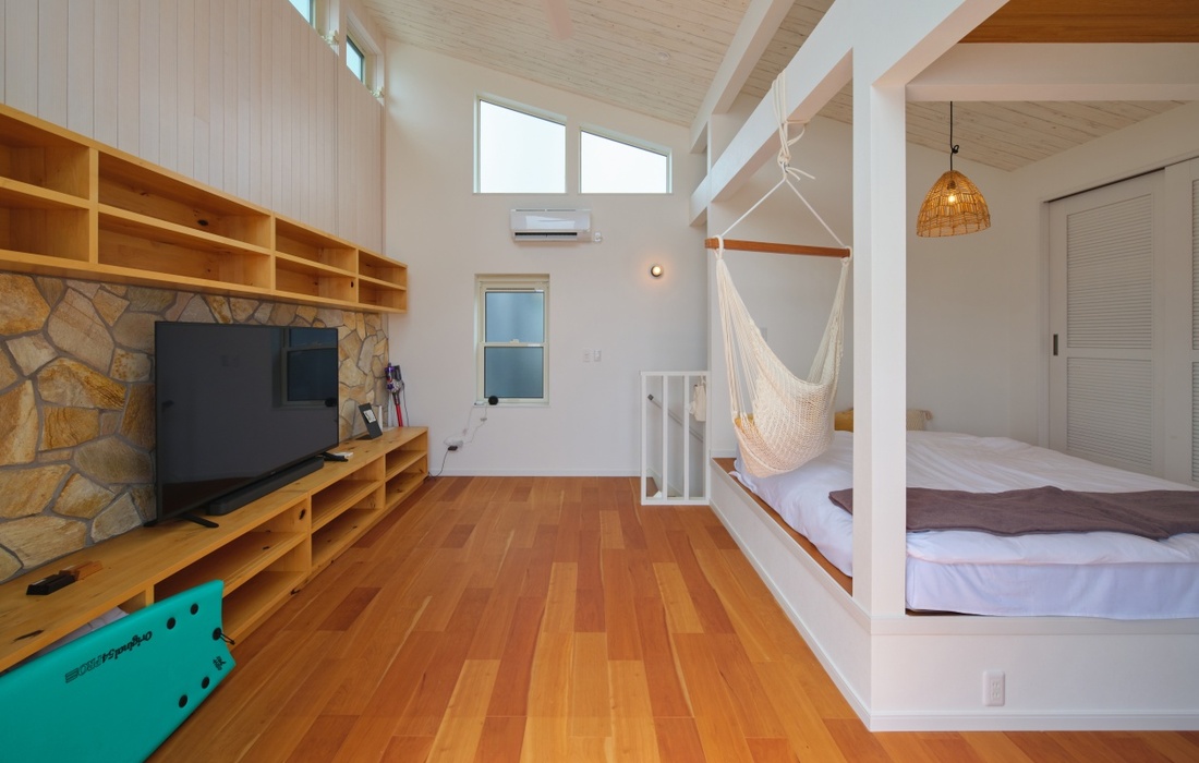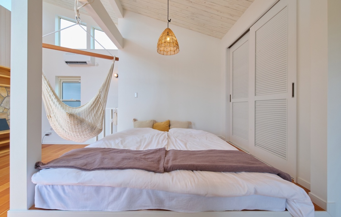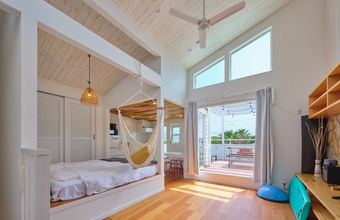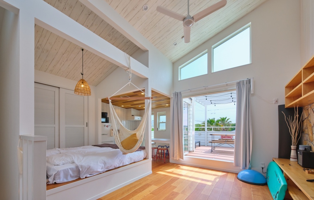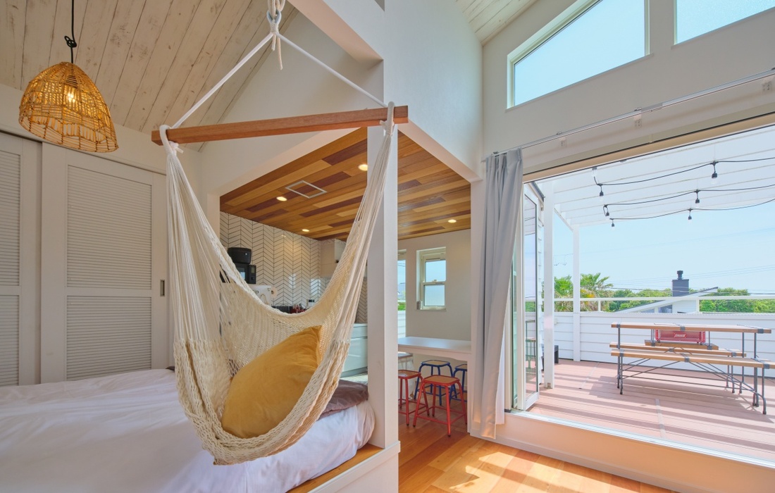 白い扉の玄関から階段を上がった先が宿泊者エリアです。 天井が高く、明るくゆったりとした造りの室内には、リゾート感のあるインテリアが置かれ、非日常の時間を演出。大きな窓から差し込む自然光が室内をやさしく照らし、より開放的な雰囲気です。また、室内にはハンモックも設置されており、昼寝や読書など、自由な時間をゆったりと過ごせます。