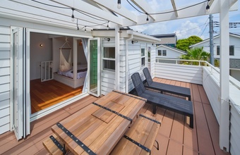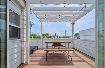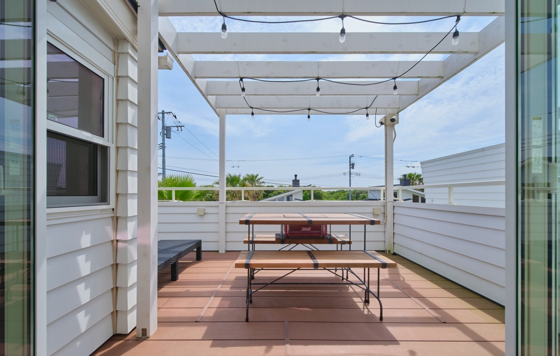 広めのバルコニーにはテーブルとベンチが備え付けられており、天気の良い日には潮風を感じながら屋外での食事も楽しめます。