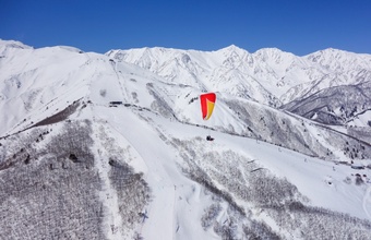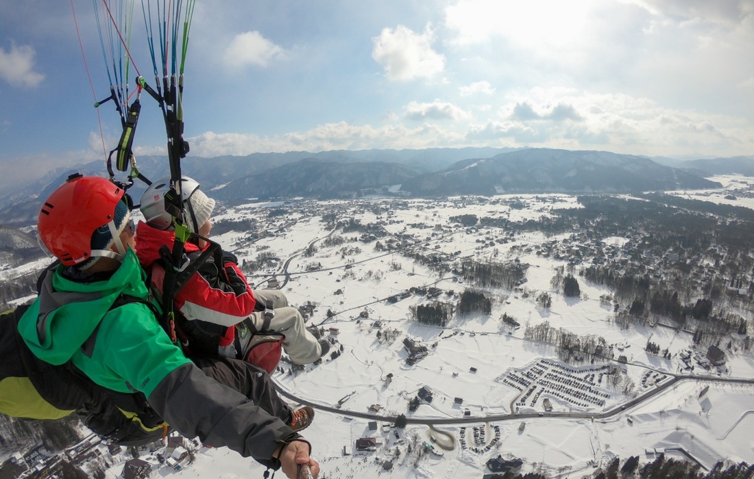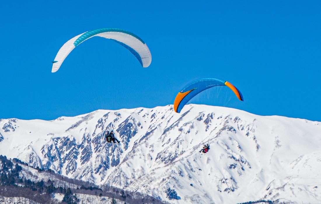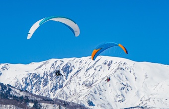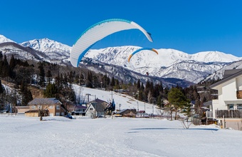 ゲレンデ内の標高1200m地点から飛び立ち、白馬ジャンプ競技場横にあるランディング場(標高750m)に着陸。スノーシーズンでは澄んだ空気の中、一面の雪景色やスキー場でウィンタースポーツを楽しんでいる人々の光景を眺めながらフライトします。