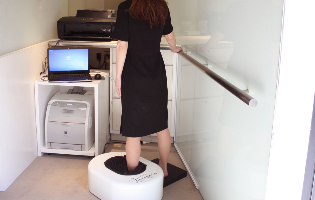 「銀座かねまつ」は、1947年に創業したレディースシューズ&バッグのブランド。その銀座本店にあるオーダーサロン「クチュリエ」で、パンプスをオーダーできるコースです。熟練のシューフィッターが、計測からオーダー、アフターケアまでを担当します。まずは3D計測器で、足の長さや幅などをミリ単位で計測。そのデータをもとに、シューフィッターが約470足のテストシューズの中から2〜3足を選び、履き比べます。