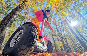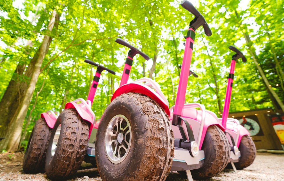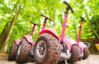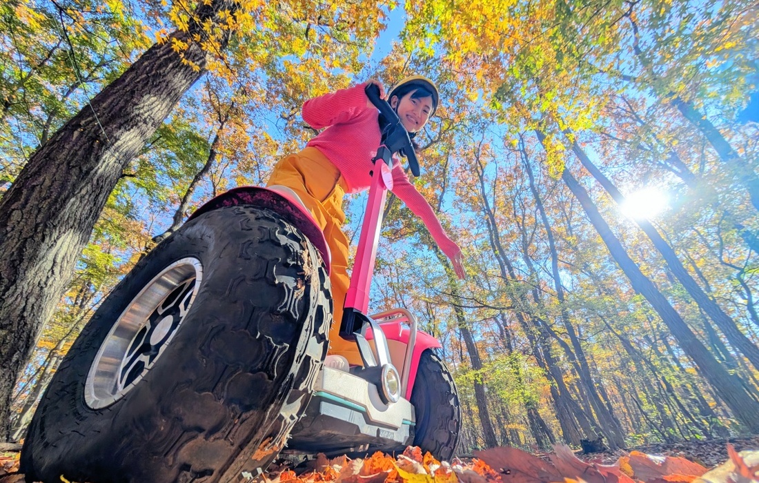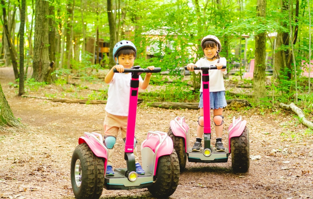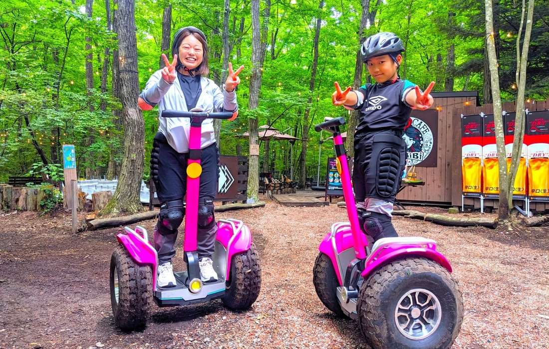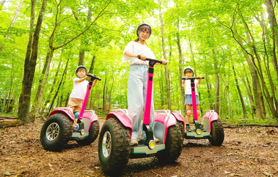 コンセプトは「森と遊ぼう!」で、フィールドは約10,000平米の広葉樹の原生林。ジャイロライド用に作られた周回コースを駆け巡れます。コースは、途中で枝分かれしており、初心者向きの「簡単コース」から、細い林道や丸太を避けながら進む「チャレンジコース」などから選択。コースなど複数コースを選択可能です。はじめにレクチャーや練習コースの体験があり、明るくホスピタリティーのあるスタッフがサポートしてくれるので笑顔でチャレンジできます。おおむね5歳からおよそ80歳まで、幅広く楽しめます。