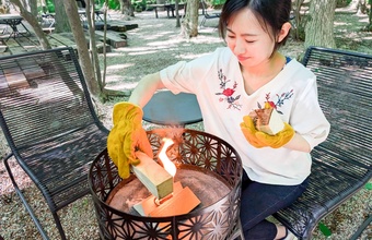 ジャイロライドの後は、併設のアウトドアカフェで、コーヒータイム。火打石を使ってたき火を起こし、コーヒー豆を焙煎します。煎っているときのパチパチと弾ける音や、はぜた瞬間に広がる豆の香りは格別。挽きたて、淹れたての香り高いコーヒーをどうぞ。希望すれば、たき火で作るポップコーンや焼きマシュマロ付きスイーツセットに変更もできます。気軽にアウトドア体験を満喫できる1日となるでしょう。