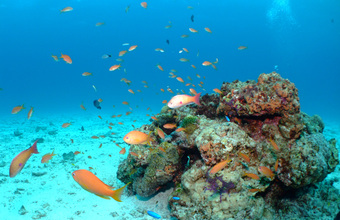 沖縄本島、恩納村(おんなそん)の真栄田岬(まえだみさき)にある青の洞窟は生息する魚・サンゴの種類の豊富さから、沖縄マリンアクティビティのメッカとも言われています。神秘的なブルーの美しさが特徴のダイビングスポットでカラフルな魚やユニークな魚と出合い、一緒に泳ぎましょう。