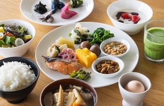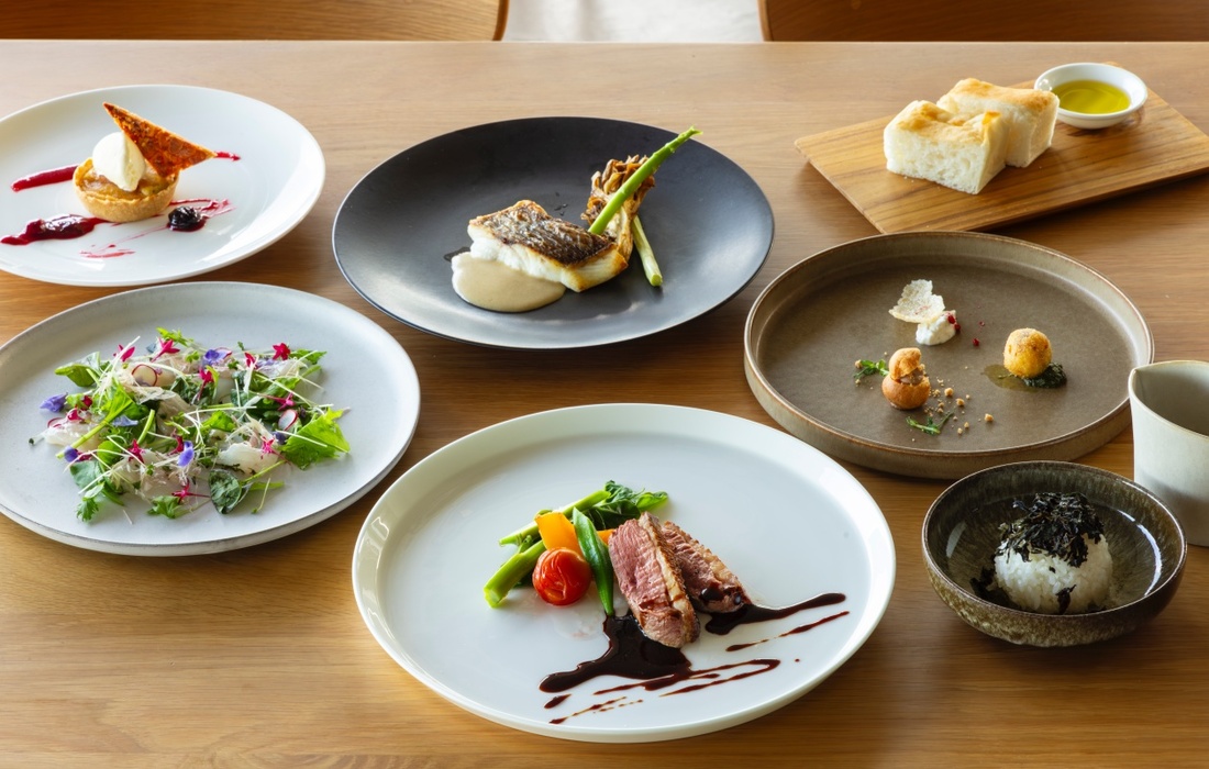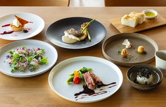 夕朝食は、月山(がっさん)を望む開放的な空間が広がるレストラン「MOON TERRASSE(ムーンテラス)」にて。「Farm to Table」のコンセプトのもと、海・山・川・平野という豊かな自然環境に恵まれた山形・庄内の食材をふんだんに使用。産地や生産者の想い、素材が持つ物語を感じられる料理が特徴です。