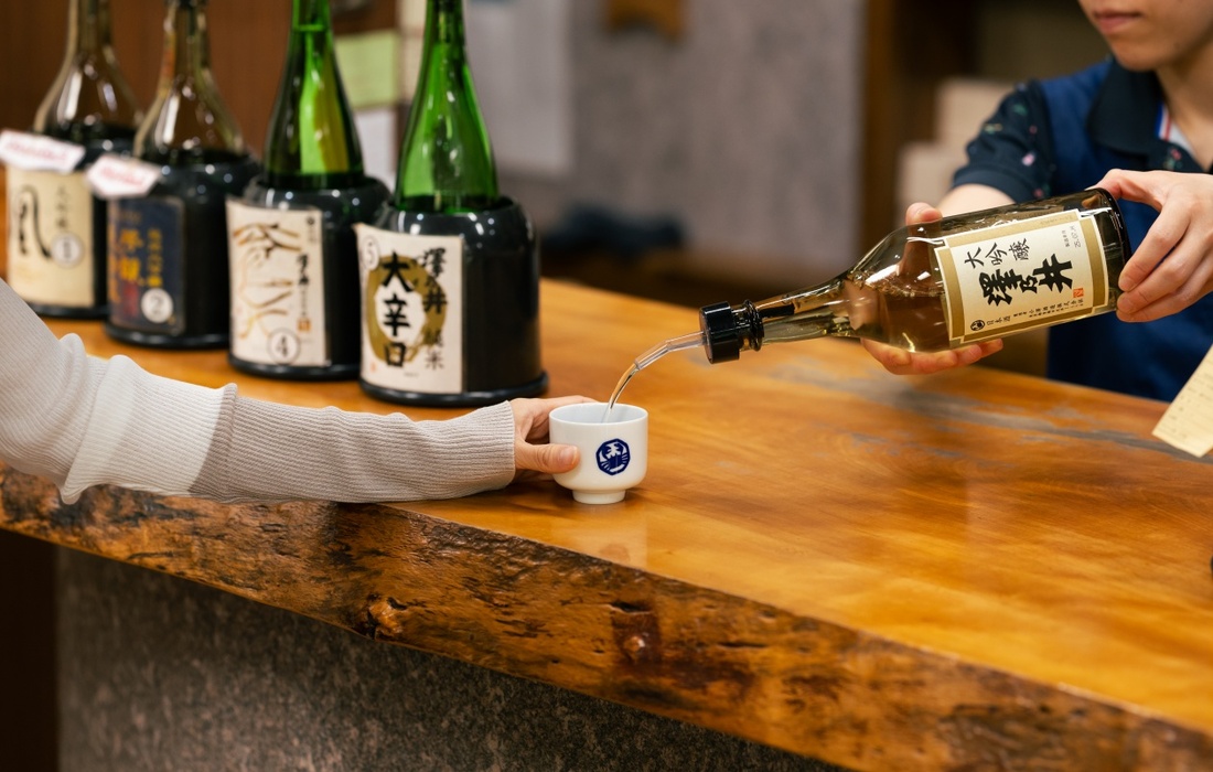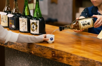 見学の後は、隣接する「清流ガーデン 澤乃井園」のきき酒処へ。きき酒とは、酒を「色」「香り」「味」で判断し、評価することです。季節限定のものや古酒など、常時10種類ほど用意されたお酒の中から、2人で4杯のきき酒をお楽しみください。