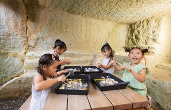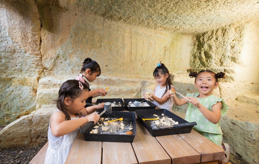 さらに、大谷石の壁を登れるクライミング体験(無料)や、有料アクティビティ「オーヤイシティ」では洞窟内での鉱石・化石探し、石の滑り台など、大人も子どもも楽しめるメニューが充実しています。