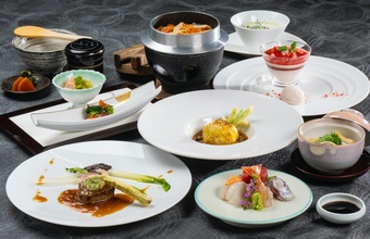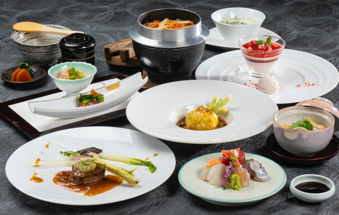 夕食はホテル内レストラン「スワサント」にて。伊豆半島の海の幸、山の幸をふんだんに使ったコース料理でお腹を満たします。