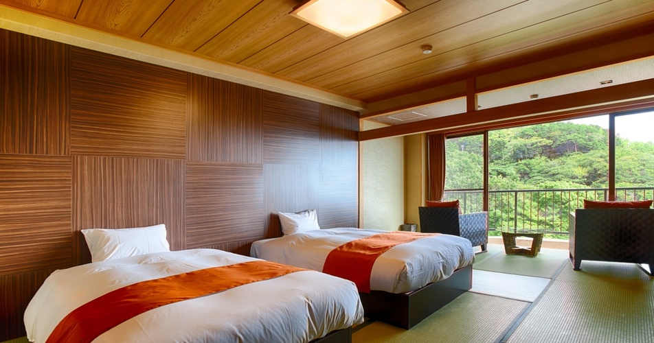宿泊する部屋は、海側和洋室のオーシャンビュー。朝は目の前に広がる太平洋からの日の出の瞬間を、夕暮れは漁り火(いさりび)を眺めながらゆっくりと過ごすことができるでしょう。