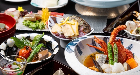 料理はイセエビやアワビ、和牛も楽しめるぜいたくなコース。定番料理として歴代調理長に代々受け継がれてきた、キンメダイの漁師煮も好評です。