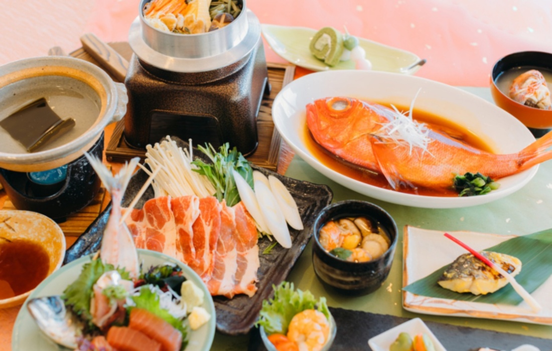 ホテルは全室オーシャンビューで、伊豆七島や相模灘を一望。カジュアルな雰囲気なので、気兼ねなく訪問できます。夕食は料理長こだわりの和懐石を。伊豆を代表する魚・キンメダイの姿煮1尾付き、アルコールを含めたドリンク飲み放題もうれしいポイントです。