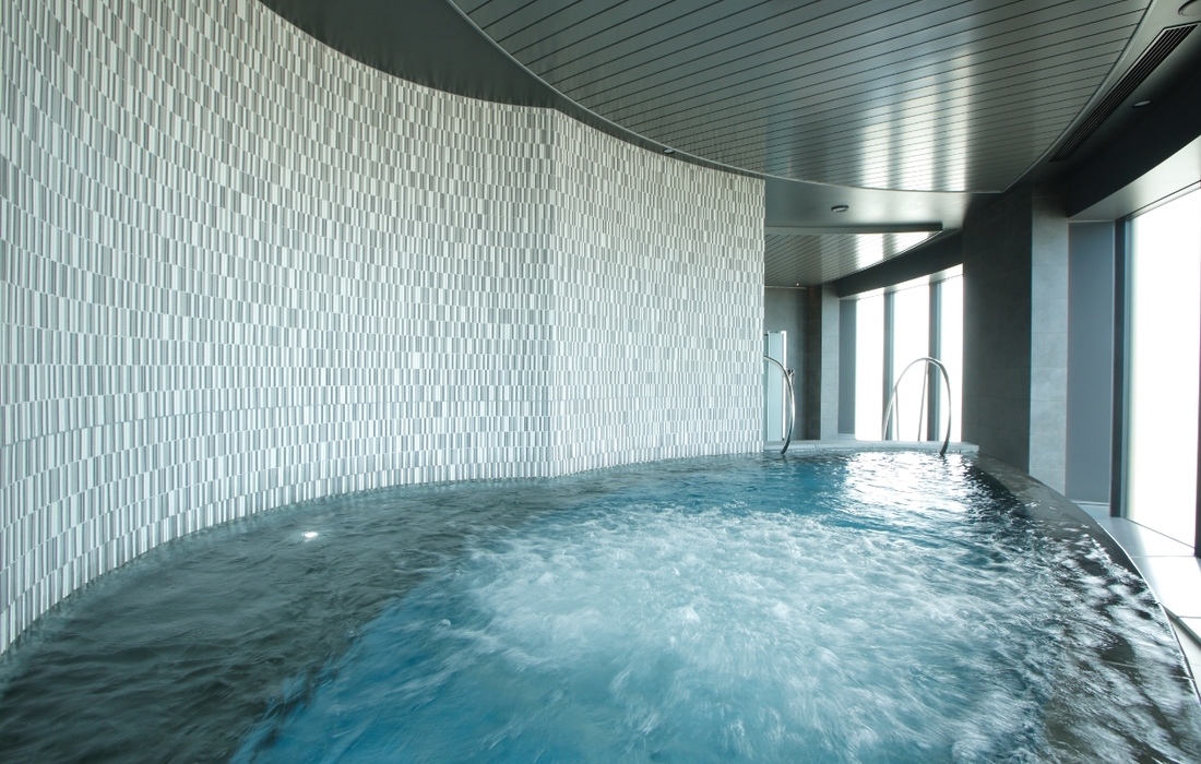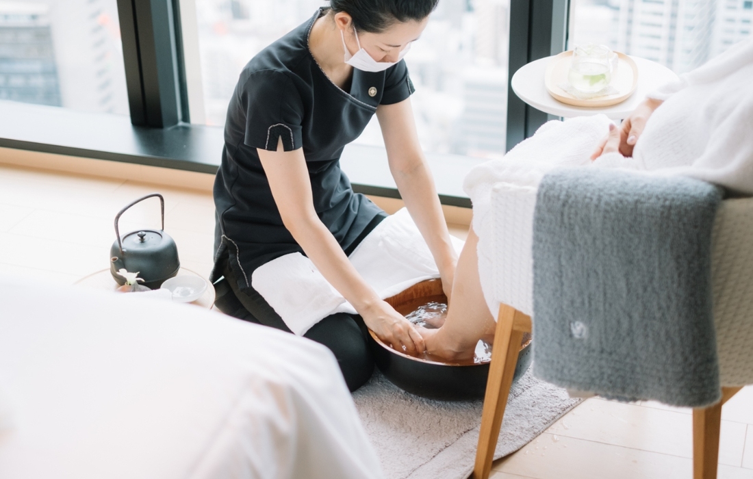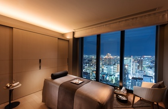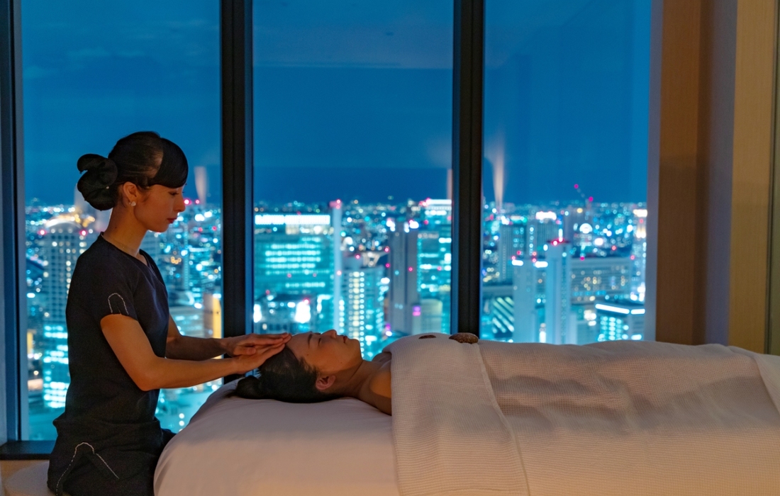 同スパでは大阪都市部の街並みはもちろんのこと、海や山々までをも望める超高層階ならではの美しい景色が印象的。本コースでは、通常宿泊客と会員のみが利用できるジェットバスやサウナが利用でき、その後にトリートメントが受けられます。
