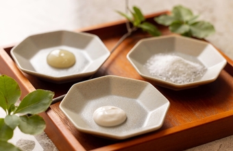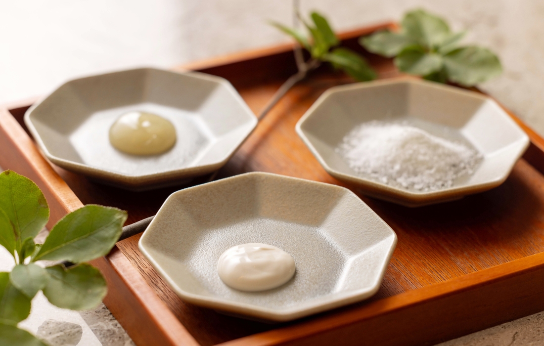 柚子、黒文字、月桃、北山杉、レモンなどの国産精油の香りは、その産地の特色や自然の恵みを反映しており、リラクゼーションを深めるための重要な要素となっています。香りの次に、肌質に合わせたキャリアオイルまたはバームを選びます。特におすすめのバームは、ミツロウやキャンデリラワックスなどを配合した天然成分100%のもの。体温でするっと溶けて柔らかな質感で全身を包みます。