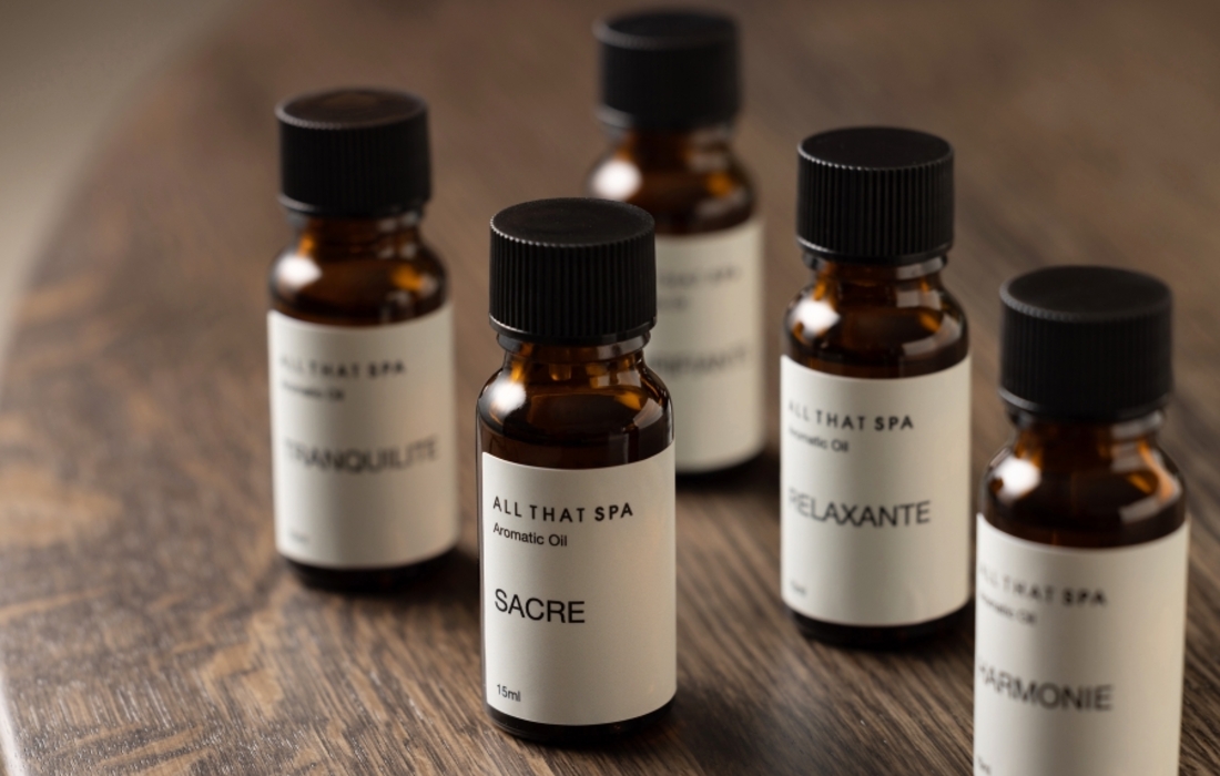 広々としたスパロビーでウェルカムティーを楽しんだ後、トリートメントに使用するコスメを選びます。使用するコスメは、すべて自社開発のスパブランド「ALL THAT SPA(オールザットスパ)」。日本全国の自然素材を活用し、優れたテクスチャーや豊かな香りが特徴です。