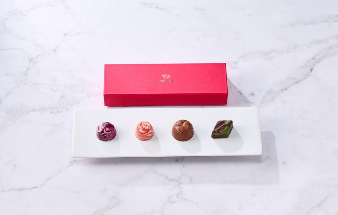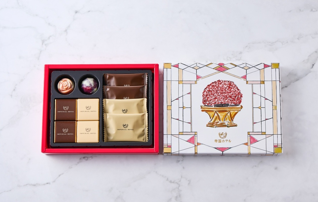 デザインパッケージに6種類のフレーバーを詰合せたチョコレートギフトです。帝国ホテル東京のロビーを彩る四季折々の装花。中でも約1,000本もの赤いバラのプリザーブドフラワーを用いた冬の装花は、ひときわ華やかで、訪れる人々を温かく迎えます。どの角度からも美しく見えるよう丁寧にアレンジされたその姿は、写真撮影スポットとしても人気があり、まさにホテルの象徴ともいえる存在です。大切な想いを届ける贈り物として、その象徴的な美しさをイラストで表現し、デザインに落とし込みました。