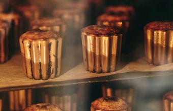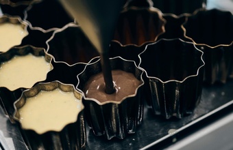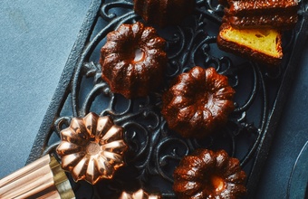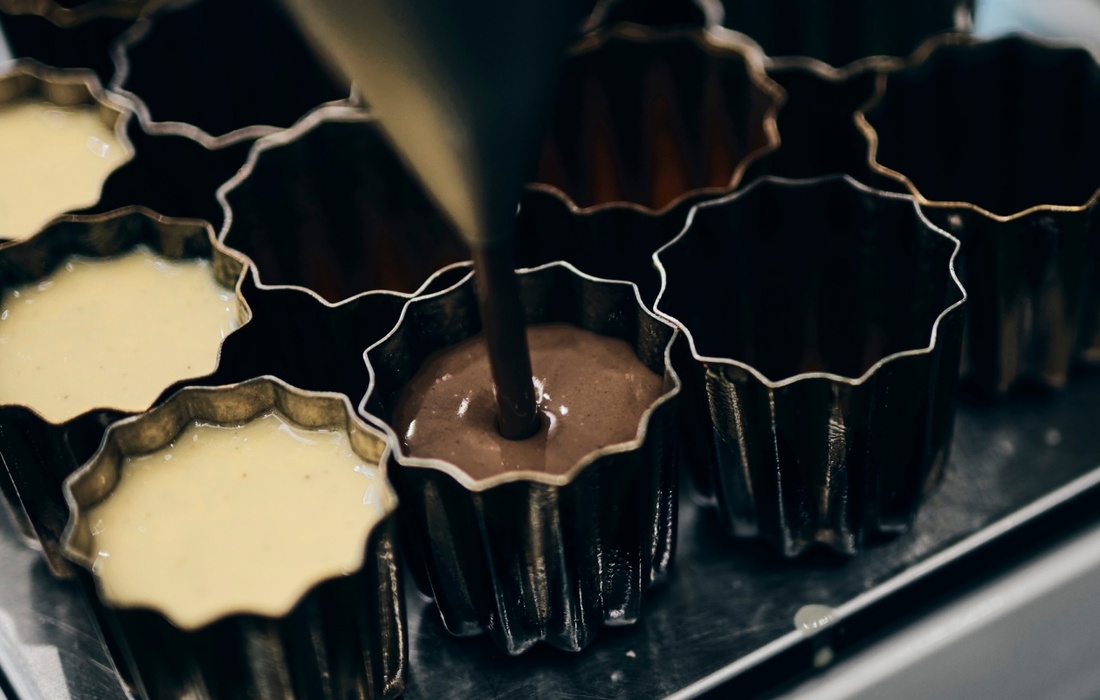 フランス・ボルドー地方の伝統菓子カヌレ。同店のカヌレは、フランス人シェフパティシエのマチュー・パンソン氏が3年かけて作り上げたこだわりのレシピをもとに、その日の温度や湿度を見極めながら、熟練した技術と経験で一つひとつ丁寧に焼き上げられています。当コースで味わえるのは、カヌレのショコラ味。ダークチョコレートをしっかりと練り込み、もっちりとした食感と奥深い味わいに仕上げています。