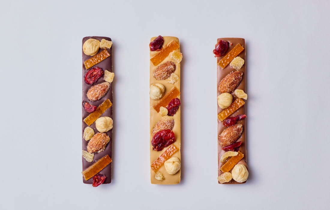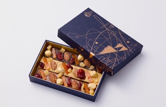 フランスの中世、托鉢(たくはつ)する修道士「マンディアン(mendiant)」に由来するマンディアンショコラ。一般的には円形状のチョコレートに、ナッツやドライフルーツを散りばめたものです。同パティスリーでは、これを色とりどりの素材が映える、バータイプに仕上げました。口に含むと、なめらかなチョコレートの口どけに、ナッツの心地よい食感とドライフルーツのやさしい甘みが重なり、豊かな味わいが広がります。